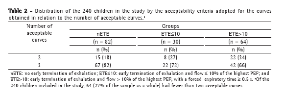 Among the 240 children tested, we obtained at least two acceptable curves in 82 (34.0%) of those in the nETE group; in 30 (12.5%) of those in the ETE≤10 group; and in 64 (27%) of those in the ETE>10 group (Table 2). In the last group, only the FEV0.5 and PEF values were considered. Analyzing the first two groups together, we found that 112 children (46.5%) performed acceptable maneuvers, in accordance with the current guidelines of the ATS and of the European Respiratory Society (ERS).