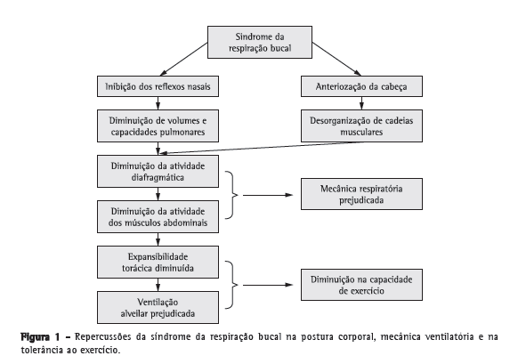 A diminuição da força muscular respiratória pode ser desencadeada pela desorganização do padrão postural ou pelo bloqueio de reflexos nasais. Esses fatores vão determinar volumes e capacidades pulmonares menores, afetando a expansão torácica e a ventilação alveolar, com diminuição da PaO2, refletindo na tolerância ao exercício.(21,22) Em casos mais graves, isso pode estar associado a síndrome da apneia obstrutiva do sono e cor pulmonale.(18)