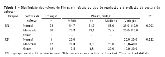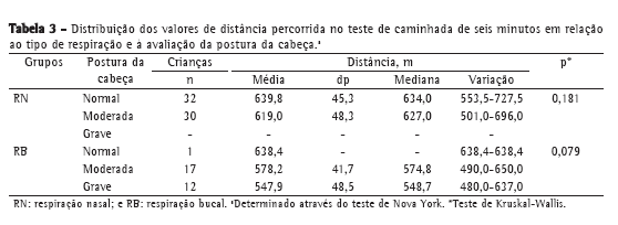 DiscussãoNo presente estudo, avaliamos a influência do tipo respiratório e da anteriorização da cabeça na capacidade de exercício e na força muscular respiratória em crianças com SRB. Não foram encontrados na literatura, até o presente momento, estudos que relacionassem todas essas variáveis.