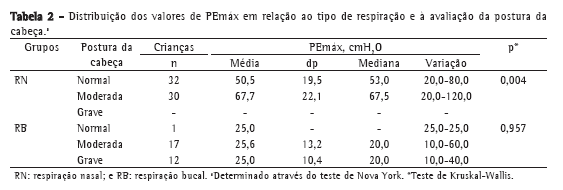 Não houve associação entre PImáx e PEmáx em relação à postura da cabeça nas crianças do grupo RB em nosso estudo. Já no grupo RN, observou-se que quanto pior a anteriorização da cabeça, maiores foram os valores de PImáx e PEmáx. Esse dado sugere que as crianças com respiração nasal utilizam essa alteração como forma de compensação, atingindo valores maiores de PImáx e PEmáx do que aqueles com postura cervical normal. Já as crianças com respiração bucal parecem ter um maior comprometimento postural, não tendo disponível maiores recursos compensatórios para a realização das manobras. Como não encontramos pesquisas que avaliaram essas associações, mais estudos são necessários para reforçar, comprovar e explicar as alterações da força muscular respiratória em relação ao tipo respiratório e à anteriorização da cabeça.