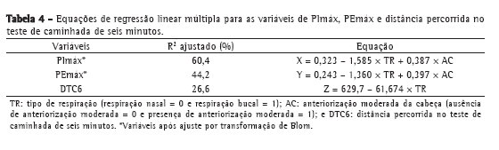 Após a análise multivariada por regressão linear múltipla da PImáx e PEmáx em relação ao sexo, idade, tipo de respiração e alteração da postura cervical, o melhor modelo ajustado para PImáx (R2 ajustado= 60,4%) incluiu somente as variáveis tipo de respiração e alteração da postura da cabeça. A respiração bucal determinou menores valores de PImáx, enquanto a alteração postural, maiores valores. O mesmo se observou no caso da PEmáx (R2 ajustado = 44,2%; Tabela 4).