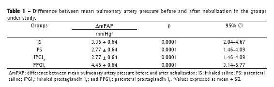 inhaled PGI2 (IPGI2) group-mechanical ventilation (2 min) + nebulization with PGI2 (Ilomedin; Schering, Traiskirchen, Austria) at 20 µg/kg (1 min) + interval (30 s) + second nebulization with PGI2 (1 min), mPAP being measured before and after nebulization