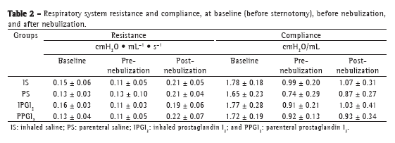 For the sample as a whole, the mPAP was 11.4 ± 0.7 mmHg before nebulization and 8.1 ± 0.8 mmHg after (p < 0.001). The analysis of the difference between the pre- and post-nebulization mPAP revealed that nebulization significantly reduced mPAP in all of the groups (Table 1). Although the reduction in mPAP was more pronounced in the PPGI2 group than in the remaining groups, the difference was not statistically significant (p = 0.63). The evaluation of respiratory mechanics during mechanical ventilation showed that the four groups behaved similarly in terms of Rrs and Crs (Table 2).