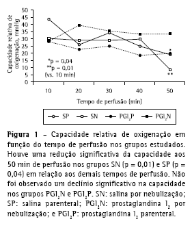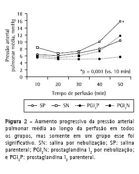 No presente estudo, a perfusão pulmonar no sistema ex vivo revelou um desempenho funcional similar nos grupos que receberam PGI2 nebulizada ou por via parenteral, com tendência à melhora na complacência pulmonar no grupo PGI2N. Os pulmões nebulizados com salina apresentaram desempenho inferior no que tange às trocas gasosas.