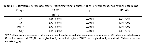A PAP média de todos os grupos, antes e após a nebulização, foi 11,4 ± 0,7 mmHg e 8,1 ± 0,8 mmHg, respectivamente (p < 0,001). A diferença entre a PAP antes e após a nebulização revelou uma redução significativa após a nebulização em todos os grupos (Tabela 1), sendo essa redução mais acentuada no grupo PGI2P, porém sem diferença estatisticamente significativa em relação aos demais grupos (p = 0,63).