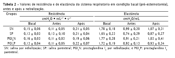 onde P é a pressão na entrada das vias aéreas, Y é o fluxo, V é o volume, e P0 é o valor que P assume quando tanto Y como V são iguais a zero, assumindo uma utilidade prática na absorção de erros em situações onde a capacidade residual funcional é calculada a partir de um sinal de fluxo integrado. Esse modelo foi ajustado a uma perturbação de volume senoidal de período de um segundo, com VC = 10 mL/kg. Foram coletados os valores basais antes e após a esternotomia e após a nebulização.