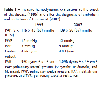 However, as in other clinical situations, imaging methods have limitations for characterizing thromboembolic disease as the cause of pulmonary hypertension, as well as for determining operability if used in isolation. An imaging finding consistent with a chronic central thrombus does not rule out the existence of distal arteriolar disease, nor does it allow us to infer the occurrence of in situ thrombosis, which has been increasingly associated with IPAH.(9) If the patient in this report had sought treatment presenting the current profile, and we had not known about the initial profile, we would have relied on angiotomography findings alone, our diagnosis would have been CTEPH, and thromboendarterectomy would have been indicated. This underscores the fundamental role of clinical evaluation in such cases. It has recently been suggested that some demographic and functional characteristics, such as advanced age and increased diffusing capacity of the lung for carbon monoxide, can help differentiate between patients with CTEPH and those with IPAH.(9)