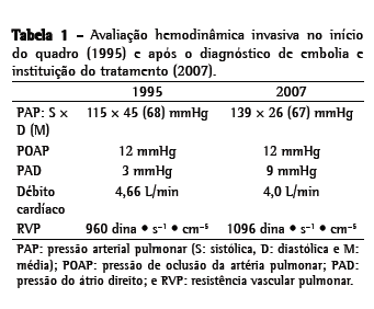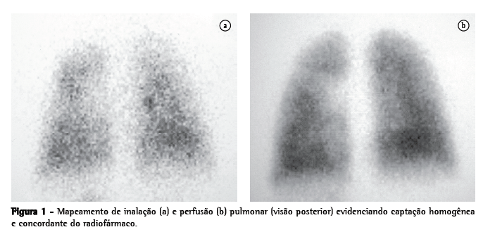 Relato de casoPaciente de 40 anos, do sexo feminino, com diagnóstico de HAPI desde 1994, apresentava dispnéia aos esforços moderados (classe funcional II/New York Heart Association). O ecocardiograma estimou a pressão sistólica da artéria pulmonar em 126 mmHg e revelou dilatação e disfunção de ventrículo direito significativas, sem acometimento de câmaras esquerdas. O cateterismo cardíaco direito associado à arteriografia pulmonar não evidenciaram falhas de enchimento compatíveis com HPTEPC e confirmaram os níveis pressóricos na circulação pulmonar (Tabela 1). A cintilografia ventilação/perfusão revelou captação homogênea do radiofármaco no mapeamento de perfusão (Figura 1). Iniciou-se tratamento não específico com digitálico e anticoagulação.