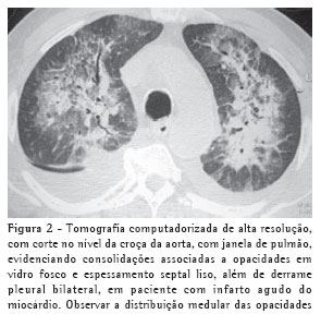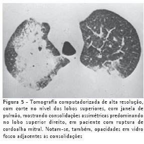 A presença de consolidação foi um achado pouco freqüente, tendo sido encontrada em apenas cinco pacientes (33%) (Figuras 2 e 5). Todos apresentavam consolidações bilaterais, sendo em dois deles de distribuição assimétrica, com aspecto em "asa de morcego" e predomínio no lobo superior direito (casos de ruptura de cordoalha da válvula mitral) (Figura 5).