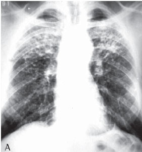 The lesions tend to form on the periphery, migrating toward the hilum, creating a zone of emphysematous lung tissue between the consolidation and the pleural surface. The borders of the large opacities are irregular and poorly defined. As the disease progresses, the masses tend to shrink. Emphysematous lesions and bullae then appear surrounding the masses and at the lung bases. The lungs gradually lose volume. The large masses seen in accelerated silicosis are capable of causing cavitation due to the resultant ischemia and necrosis. Nevertheless, cavitation is a relatively uncommon finding in silicosis. When it does occur, one should first consider tuberculosis. The pleural thickening frequently observed in tuberculosis is also commonplace in PMF, although pleural effusion is extremely rare.(17)