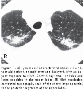 INTRODUCTIONSilicosis is a pulmonary disease contracted through the inhalation of crystalline silica, which induces a fibrogenic tissue response.(1) Silicosis can be clinically categorized into three forms, based on the course of the disease: chronic, accelerated and acute.(2) The chronic form is the most common, occurring after years of exposure to relatively low levels of dust.