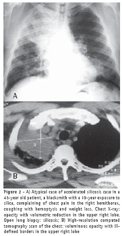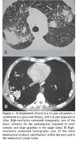 DISCUSSIONSilicosis is the most prevalent pneumoconiosis in Brazil and in the world at large. Interest in this disease was sparked when a high incidence was reported among longshoremen working on the docks at the port of Guanabara Bay, in the city of Niterói, who had sought medical attention in regional hospitals. These patients, typically exposed to exceptionally high concentrations of silica particles, had developed a form of the disease that was accelerated and more frequently evolved to the complex form, accompanied by the formation of large fibrous masses that distort and destroy to the lung architecture.(12)