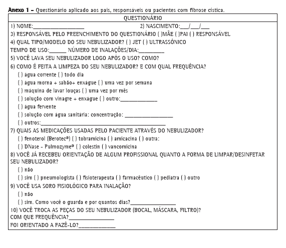 Os familiares responderam um questionário sobre os métodos de limpeza e de desinfecção dos nebulizadores, incluindo o tipo de limpeza e de desinfecção, frequência/tempo de uso do nebulizador e de suas peças, medicações usadas com o nebulizador e tipo do nebulizador (Anexo 1).