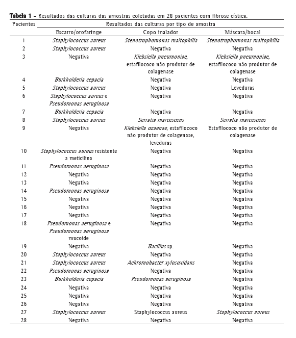 Houve crescimento bacteriano nas culturas de escarro e de orofaringe de 15 pacientes, e as bactérias mais frequentemente encontradas nessas amostras foram S. aureus (em 8), P. aeruginosa (em 4) e complexo B. cepacia (em 3). Nos nebulizadores de 6 pacientes houve crescimento de bactérias relacionadas à FC.