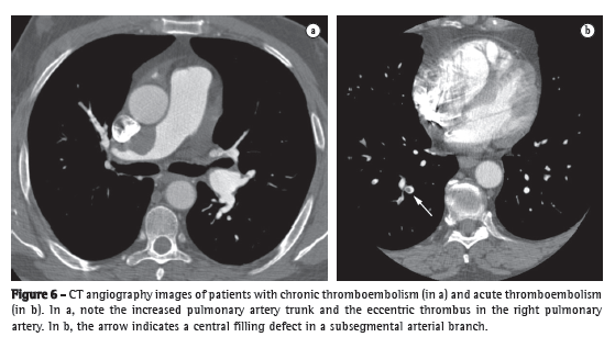 Having been widely studied, CT angiography has gained significant ground in the evaluation of acute PTE, becoming as accurate as pulmonary angiography but without its invasive nature. Some authors consider CT angiography to be the diagnostic imaging method of choice in the assessment of acute PTE.(34-36) This is explained by the various advantages of CT angiography: its high resolution allows the visualization of arteries and filling defects up to the distal portion of the pulmonary vasculature, reaching subsegmental vessels of 2-3 mm (Figure 6); it has excellent interobserver agreement, far superior to that of scintigraphy; its sensitivity is so high that a negative test result allows the safe discontinuation of anticoagulation therapy.(37) One must be alert, however, to the dangers inherent in the method. Technical or pathophysiological factors might lead to the interpretation of pseudo-filling defects, providing false-positive results. The possibility of motion artifacts in patients with tachypnea should be taken into consideration, as should the time interval between contrast injection and image acquisition, as well as the occurrence of hypoxic pulmonary vasoconstriction in poorly aerated regions. The advent of 64-channel scanners created another danger: the possibility of an excessive number of false-positive results. However, that possibility was ruled out in a recent study.(38)