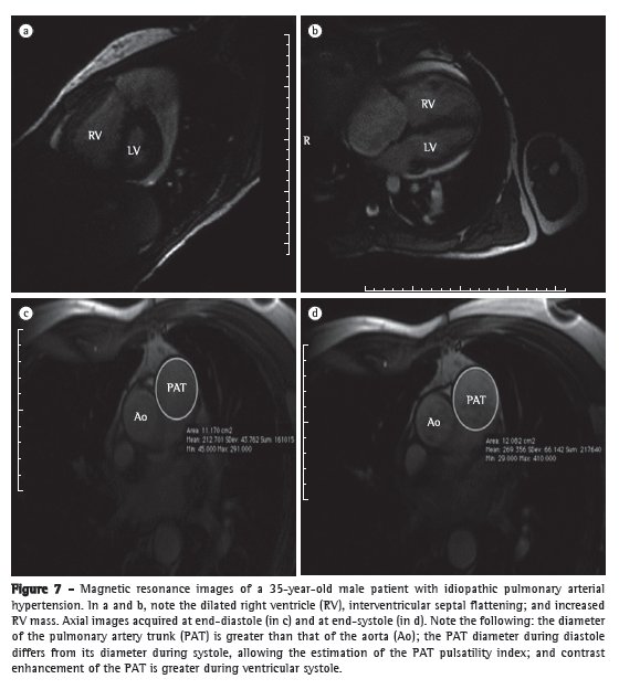 Chief among the useful functions of pulmonary MRA is its great importance in detecting acute or chronic pulmonary embolism. In this context, a study published in 2002(47) evaluated 141 patients with suspected PTE and with abnormal perfusion scintigraphy findings. The sensitivity of MRA for segmental and central embolism (84% and 100%, respectively) was found to be comparable to that of pulmonary arteriography. However, for subsegmental embolism, the sensitivity of MRA was low (40%). Other studies(48,49) have confirmed these findings, and MRA plays a very interesting role in patients with suspected PTE who have contraindications to the use of iodinated contrast material or who want to avoid ionizing radiation. Another promising use of MRA is in the noninvasive evaluation of patients with PAH. One group of authors(50) investigated the use of MRI in the evaluation of responders to vasodilator testing with inhaled NO. When analyzing the mean pulmonary artery distensibility, those authors found a sensitivity of 100% in the identification of responders, with a specificity of 56% when compared with