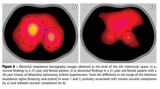 An excellent model of disease in the pulmonary microcirculation is PAH, in which vascular remodeling directly affects the distensibility properties of microcirculation. When vascular compliance is reduced, with consequent accommodation of lower volumes, the electrical impedance change in PH is likely to be decreased as well. In one study,(59) EIT was used in patients with PH for determining vascular response to vasodilator testing with epoprostenol during invasive hemodynamic assessment. Of the 8 patients evaluated, 7 did not meet the vasodilator response criteria, EIT showing no impedance change in those 7. In the lone responder, the increase in impedance change was found to correlate strongly with decreases in mPAP and pulmonary vascular resistance, regardless of the increase in systolic volume. In another study,(60) the differences in the impedance of the pulmonary circulation were analyzed in 21 patients with idiopathic PAH (IPAH) and 30 healthy subjects. The authors observed a reduction in impedance change in the IPAH group, which provides support for the use of EIT in the assessment of the pulmonary circulation and of PH.
