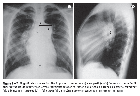 Embora a presença de HP possa ser sugerida pela radiografia convencional, a especificidade desse método e o grau de acurácia na estimativa de sua gravidade são controversos.(7) Inúmeros fatores alteram as medidas das artérias interlobares, como, por exemplo, o tamanho do paciente, a distância entre a ampola do raio X e o filme e a distância entre a artéria pulmonar e o filme. Muitos parâmetros utilizados são subjetivos, e as medidas possuem baixa correlação com o grau de HP.(7)