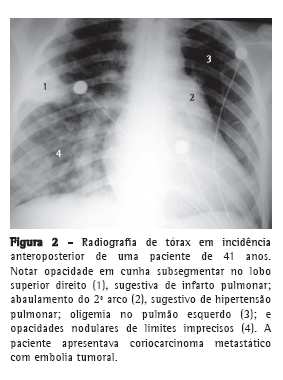 A radiografia de tórax pode auxiliar no diagnóstico diferencial com doenças do parênquima pulmonar, insuficiência cardíaca, DPOC e cifoescoliose, podendo levar a suspeita de doença tromboembólica pulmonar quando se notam áreas de oligemia, consolidações múltiplas sugestivas de infartos pulmonares ou assimetria entre as artérias pulmonares principais (Figura 2).(7)