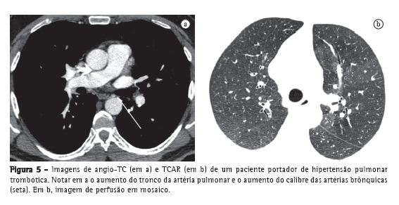 No âmbito da HP, a angio-TC apresenta importância diagnóstica e tem grande valor na investigação etiológica.(27) O método permite o estudo da imagem do VD, do TAP e da circulação pulmonar periférica.
