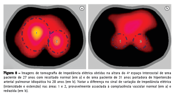 Um tomógrafo de 32 eletrodos vem sendo desenvolvido no Brasil para o estudo da perfusão pulmonar. Alguns achados de sua aplicação no contexto de HAPI (Figura 8) são animadores e demonstram não só a redução do valor de impedância elétrica, tal qual nos dois estudos anteriores, como também a alteração da morfologia da onda de impedância, o que pode se correlacionar com a onda de pulso da circulação pulmonar.