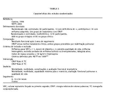 Neste estudo, procurou-se utilizar a revisão sistemática não-quantitativa, para avaliar se existiria um padrão radiológico ideal que estivesse relacionado com o prognóstico da intervenção. O estudo National Emphysema Treatment Trial(16) é o único com metodologia adequada para avaliar esta questão. O artigo de Cassina et al.(17) é também randomizado; entretanto, a alocação dos participantes é inadequada e o número de pacientes é pequeno (n = 30), amostragem não satisfatória para afastar a hipótese de erro do tipo II, o que poderia comprometer a interpretação dos resultados. Além disto, avaliou uma população heterogênea de pacientes, ao considerarmos que a evolução e o comportamento biológico do enfisema por deficiência de µ1-antitripsina diferem das características do enfisema associado ao tabagismo. Apesar disso, o estudo permite concluir que pacientes portadores de enfisema heterogêneo, associado ao tabagismo, têm maior taxa de sobrevida e ganho funcional, quando submetidos à CRVP, se comparados com os resultados dos pacientes enfisematosos por deficiência de µ1-antitripsina, também tratados cirurgicamente.