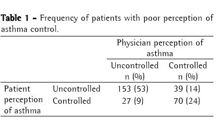 In conclusion, the frequency of patients with asthma who present poor perception of disease control is significant. Special attention should be given to elderly patients with a lower family income and milder asthma. Such patients are at a higher risk of inaccurately perceiving disease control, and a more careful clinical evaluation is necessary. Further studies should be conducted to determine whether a program of asthma education could reverse this situation.
