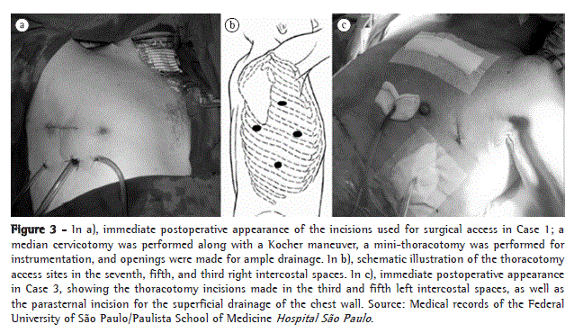 Currently, minimally invasive intervention with the aid of video-assisted thoracoscopy is widely used. The first report of this surgical approach for the treatment of descending mediastinitis, describing the first cases treated with the combination of cervicotomy and video-assisted thoracoscopy, was published in 1997.(13) The importance of the concept "minimally invasive" approach is that, for patients with descending mediastinitis, who usually have severe systemic infection, it offers advantages such as less surgical trauma, lower production of inflammatory cytokines, and less postoperative pain. Therefore, we observed a greater capacity for recovering hemodynamic stability and respiratory capacity after the surgical procedure, not to mention the aesthetic effect. Other reports, documenting the excellent rate of resolution of the infection, without the need for further surgical intervention, have followed.(4,7,12)