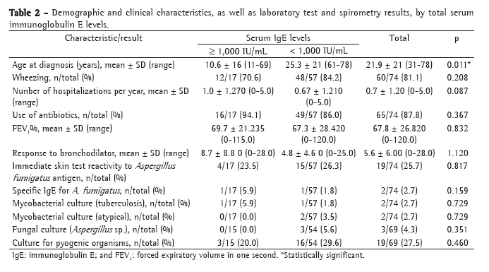 In a longitudinal study involving 118 patients with CF, it was reported that 42% of the patients without ABPA presented skin test reactivity to A. fumigatus antigen, 42% presented antibodies (precipitins), 54% presented IgE positivity to A. fumigatus, and 23% had IgE levels > 500 IU/mL. According to those studies, the best screening tests continue to be immediate skin test for reactivity to A. fumigatus antigen, determination of total serum IgE levels and determination of the presence of antibodies (precipitins) to A. fumigatus.(26) Our findings can be superimposed, with values of total IgE ≥ 1,000 IU/mL in 23% of the cases and immediate skin test reactivity to A. fumigatus antigen in 25% (Table 2).