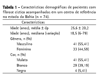 Foram avaliados 74 pacientes com diagnóstico de FC. Destes, 41 (55,4%) eram do gênero masculino. A média de idade ± dp foi 25,6 ± 20,2 anos e mediana de 18,5 anos. Do total de pacientes, 29 (39,2%) eram brancos e 45 (60,8%) eram afro-descendentes (Tabela 1).