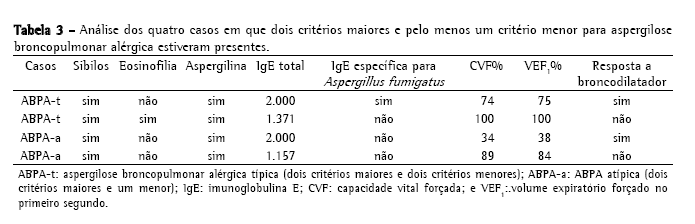 A Tabela 3 mostra a análise dos 4 casos com critérios para diagnóstico de ABPA.