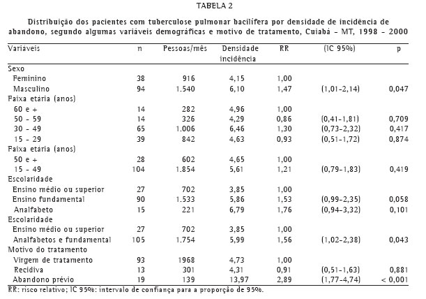 Na Tabela 2 pode ser observado que a densidade de incidência de abandono foi maior no sexo masculino (6,10 versus 4,15 por 100 pessoas/mês) do que no feminino e esta diferença foi estatisticamente significativa (risco relativo de 1,47; p = 0,047). A comparação entre as quatro faixas etárias originalmente classificadas não demonstrou qualquer diferença estatisticamente significativa. Nesse mesmo sentido, ao se reagrupar as faixas etárias em 15 a 49 anos e 50 anos ou mais, o resultado permaneceu sem significância estatística (p = 0,419). Quanto à escolaridade, evidenciou-se uma diferença estatisticamente limítrofe com a categoria dos indivíduos com o ensino fundamental (risco relativo de 1,53; p = 0,058). Ao se agrupar os indivíduos analfabetos com aqueles que tinham até o ensino fundamental, a densidade de incidência de abandono foi maior entre os pacientes com menor escolaridade e esta diferença foi estatisticamente significativa (risco relativo de 1,56; p = 0,043). Quanto ao motivo do tratamento, observou-se que nos pacientes com história de abandono prévio de tuberculose, a densidade de abandono foi quase três vezes maior do que naqueles considerados como virgens de tratamento (categoria de referência) (13,97 versus 4,73 por 100 pessoas/mês), e esta diferença foi estatisticamente significativa (risco relativo de 2,89; p < 0,001).