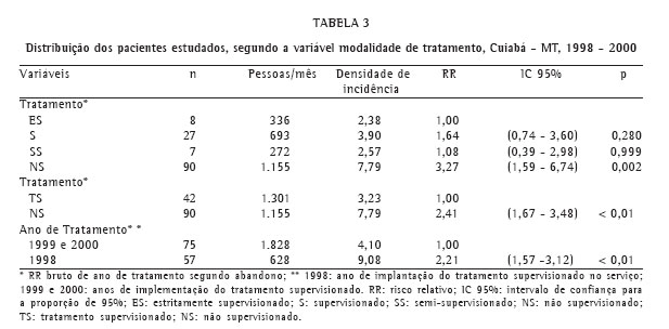 Quando se analisa a influência da modalidade do tratamento no abandono do tratamento da tuberculose, os resultados mostram que a incidência de abandono foi menor nos grupos supervisionados. Entre os indivíduos com tratamento não supervisionado a chance de abandono foi 2,41 vezes maior, permanecendo esta modalidade de tratamento como maior preditora de abandono neste estudo. Há que se ressaltar, também, que o tratamento semi-supervisionado e o tratamento estritamente supervisionado apresentaram incidências de abandono quase semelhantes (2,57 e 2,38, respectivamente), o que leva à hipótese de que o tratamento semi-supervisionado, mesmo sendo menos rigoroso quanto à supervisão dos medicamentos ingeridos, parece ser tão efetivo quanto o tratamento estritamente supervisionado, fato que é corroborado por outro estudo.(24)