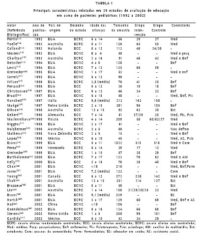 Participaram dos 39 ensaios clínicos 5.513 pacientes. Os ensaios controlados envolveram 4.205 pacientes, 2.044 fazendo parte dos grupos controle e 2.161 dos grupos intervenção. Em cada trabalho, o número de pacientes envolvidos variou de 15 a 1.033 (Tabela 1). Em 19 estudos, havia participantes adolescentes e 10 estudos incluíam crianças com idade menor ou igual a dois anos (Tabela 1). O tempo de seguimento dos pacientes, após a intervenção, variou de 3 semanas a 24 meses. A proporção de participantes que completaram o seguimento variou de 43% a 100%, nos 31 trabalhos que referiram esse dado. Em 33 estudos foram apresentadas informações sobre as equipes que realizaram o trabalho educativo (Tabela 1). O local de realização das atividades educativas foi variável: domicílio, hospital, escola, acampamento, clínica, e dois trabalhos realizaram sessões educativas em mais de um ambiente.(45,49)