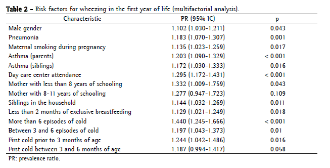 The multivariate analysis revealed the following risk factors for wheezing in the first year of life: male gender (in 57%); history of pneumonia (in 17%); maternal smoking during pregnancy (in 23%); day care center attendance (in 24%); low maternal level of education (in 79%); early weaning (in 62%); multiple episodes of cold (in 21%); first viral infection prior to 3 months of age (in 40%); siblings in the household (in 68%); and history of asthma in the nuclear family-parents or siblings (in 47%). Other data regarding a history of allergy, such as rhinitis and dermatitis, in the nuclear family did not achieve statistical significance. Other factors associated with risk of wheezing in the first year of life, such as environmental exposure to smoking, maternal smoking, hospitalization for pneumonia, and atopy (dermatitis) in the infant, despite showing statistical significance in the bivariate analysis, did not maintain this significance in the multivariate analysis model (Table 2).