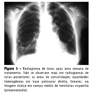 Of a total of 12 cases reported, 5 were submitted to a tomography scan of the chest.(4,17,18) Consolidations, in general focal and of basal predominance, were detected in four patients; pleural effusion was detected in one patient; and peribronchial nodules in isolation were described in one patient. No extensive consolidations were reported. The small number of patients does not allow us to establish a pattern, although consolidations were found in 80% of the patients.