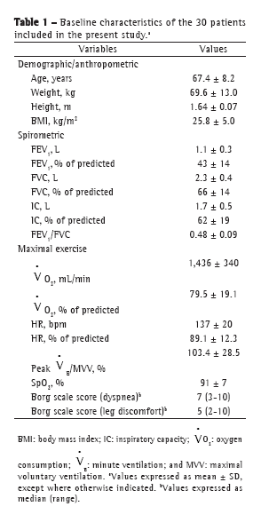 As shown in Table 1, the patients generally presented with moderate to severe obstructive lung disease and reduced FVC. Of the 30 patients, 24 (80%) presented with IC reductions that are typically related to EFL at rest (< 80% of predicted).(25) As expected, all of the patients presented with airflow limitation on exertion, dyspnea being the principal symptom limiting exercise. The gas exchange threshold was identified in 10 patients and corresponded to 51.3 ± 10.1% of the maximal O2 predicted, values that were within or slightly below the expected range for the age bracket and gender.