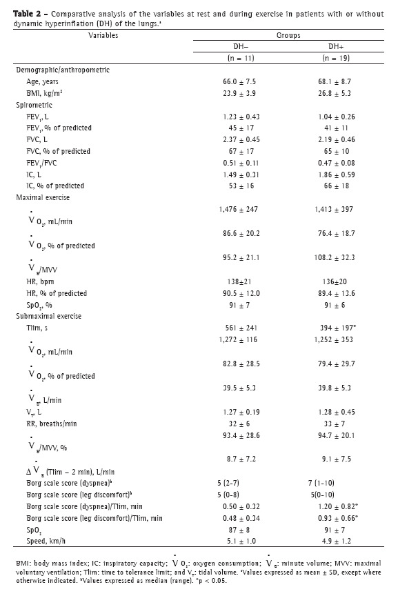 Objective: To characterize the presence, extent, and patterns of dynamic hyperinflation (DH) during treadmill exercise testing in patients with moderate to severe COPD. Methods: This was a cross-sectional study involving 30 non-hypoxemic patients (FEV1= 43 ± 14% of predicted) who were submitted to a cardiopulmonary exercise test on a treadmill at a constant speed (70-80% of maximum speed) to the tolerance limit (Tlim). Serial inspiratory capacity (IC) maneuvers were used in order to assess DH. Results: Of the 30 patients studied, 19 (63.3%) presented with DH (DH+ group), having greater pulmonary function impairment at rest than did those without DH (DH− group). None of the variables studied correlated with exercise tolerance in the DH− group, whereas Tlim, IC, and perception of dyspnea during exercise did so correlate in the DH+ group (p < 0.05). In the DH+ group, 7 and 12 patients, respectively, presented with a progressive and a stable pattern of DH (ΔICTlim,2min = −0.28 ± 0.11 L vs. 0.04 ± 0.10 L; p < 0.01). Patients with a progressive pattern of DH presented with higher perception of dyspnea/Tlim rate and lower exercise tolerance than did those with a stable pattern (354 ± 118 s and 465 ± 178 s, respectively; p < 0.05). Conclusions: The presence of DH is not a universal phenomenon during walking in COPD patients, even in those with moderate to severe airflow limitation. In the patients who presented DH, a progressive pattern of DH had a greater impact on exercise tolerance than did a stable pattern of DH.