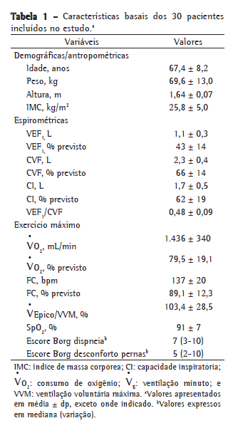 Conforme demonstrado na Tabela 1, os pacientes, em média, apresentavam distúrbio obstrutivo de grau moderado a acentuado com redução da CVF. Reduções da CI que estão habitualmente relacionadas com LFE no repouso (< 80% do previsto)(25) foram observadas em 24 dos 30 pacientes (80%). Como esperado, todos os pacientes apresentaram limitação ventilatória ao exercício e dispneia como principal sintoma limitante. O limiar de troca gasosa foi identificado em 10 pacientes, correspondendo a 51,3 ± 10,1% do O2 máximo previsto, valores esses dentro ou ligeiramente abaixo do esperado para idade e gênero.