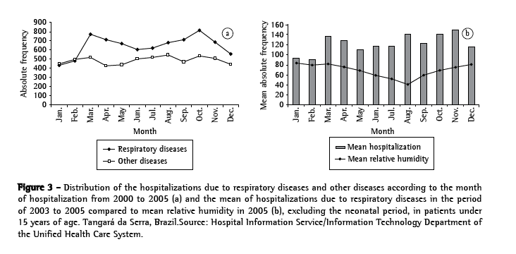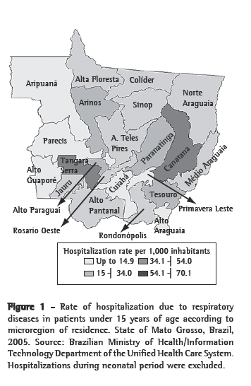 We constructed rates of hospitalization due to respiratory diseases in patients under 15 years of age according to the microregions of the state of Mato Grosso, Brazil for the year of 2005. The proportion of hospitalizations per ICD-10 chapter per year was calculated based on the admissions of Tangará da Serra residents of all ages. Hospitalizations due to respiratory diseases were compared to hospitalizations due to pregnancy, delivery and puerperium since the latter is the principal cause of hospitalizations registered in Brazil.(19) Proportions and hospitalizations in patients under 15 years of age were calculated, as was the linear tendency of this rate. The mean of monthly admissions for this period was calculated and presented as a figure together with the mean air humidity in 2005. The variables selected for study were gender, age, month of hospitalization, year of hospitalization, ICD-10 chapters, groups of causes and evolution. The neonatal period was excluded from the analyses or analyzed separately, in function of the importance of the component attention to prenatal care and delivery for the morbidity and mortality of this age group. The software TabWin (http://www.datasus.gov.br) was used for conversion and analysis of the data obtained from the Departamento de Informação e Informática do SUS (DATASUS, Information Technology Department of the SUS). The study was approved by the Ethics in Research Committee of the Federal University of Mato Grosso Julio Muller University Hospital on January 24, 2007.