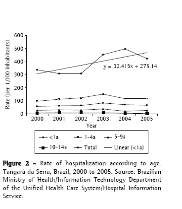 Excluding the neonatal period, boys presented a mean rate of hospitalization due to respiratory diseases of 63.6/1,000 children in 2000 and 72.7/1,000 children in 2005, which was 20% higher than that found for girls. Among girls, this rate increased from 47.4/1,000 children in 2000 to 76.3/1,000 children in 2003.