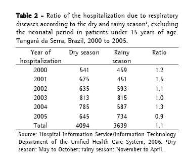 This was a cross-sectional study of hospital morbidity due to respiratory diseases (chapter X of the tenth revision of the International Classification of Diseases-ICD-10-codes J00 to J99) of the residents in the city of Tangará da Serra, in the period of 2000 to 2005. We used the authorized hospital admissions database of the Brazilian Ministry of Health Sistema Único de Saúde (SUS, Unified Health Care System) Hospital Information System.