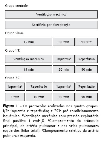 Utilizou-se um modelo experimental de lesão de I/R pulmonar em ratos, in situ, baseado em um modelo estabelecido na literatura e por nós utilizado previamente.(29) No presente estudo, realizou-se PCI com o clampeamento arterial pulmonar seletivo, sem oclusão brônquica e das veias pulmonares. O protocolo de PCI utilizado (5 min de isquemia seguido por 10 min de reperfusão), foi baseado nas observações de um estudo(26) no qual o PCI de 5 min em relação ao de 10 min resultou em uma melhor troca gasosa e melhor mecânica pulmonar, além da diminuição na expressão do fator de necrose tumoral alfa no lavado broncoalveolar de cães submetidos a lesão de I/R in situ. Além disso, Du et al. demonstraram que 5 min de PCI resultou em menor lesão de I/R em modelo de transplante pulmonar em ratos.(22) Utilizou-se no presente estudo o tempo de reperfusão de 90 min com base nos achados de outro estudo(30) que demonstrou em modelo in situ de I/R, por meio de quimioluminescência e de um sistema de monitoramento contínuo, que havia uma produção contínua e crescente de superóxido até os 90 min de reperfusão.