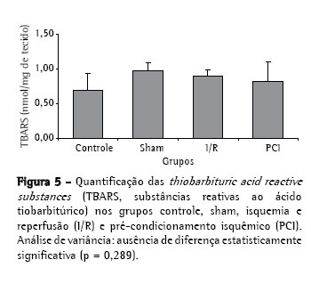 Não houve diferença estatística significativa entre os grupos em relação ao peso dos animais (p = 0,822) e ao tempo do procedimento cirúrgico (p = 0,560). Os achados da gasometria arterial, os valores da pressão parcial arterial de oxigênio (Figura 2) e da pressão parcial arterial de gás carbônico (Figura 3) não apresentaram diferença estatisticamente significativa entre os grupos experimentais (sham, I/R e PCI) nos quatro tempos de coleta. A pressão arterial média apresentou queda gradativa e progressiva durante o período de observação em todos os grupos. No entanto, não houve diferença estatisticamente significativa entre os grupos estudados (sham, I/R e PCI) nos quatro momentos de medida (Figura 4). A quantificação dos produtos da peroxidação lipídica, por meio da determinação das TBARS analisadas nos quatro grupos (controle, sham, I/R e PCI) não demonstrou diferença estatisticamente significativa (p = 0,289; Figura 5).