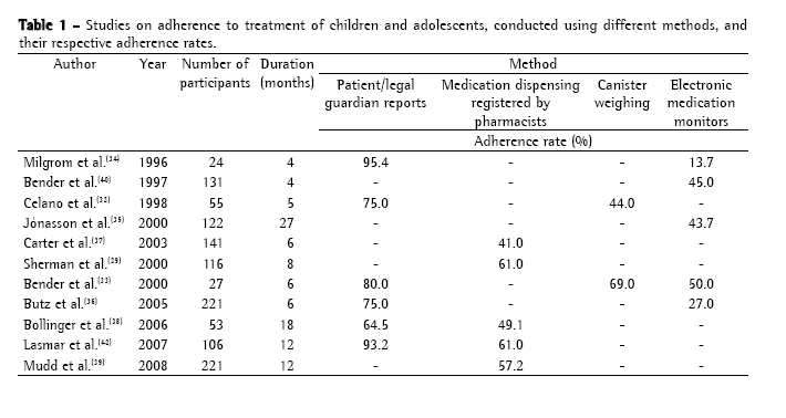 Nonadherence implies partial control of the disease and can cause persistent symptoms, increasing school absenteeism and visits to emergency rooms, with a higher risk of a fatal exacerbation. Understanding the factors that influence adherence to asthma treatment can help families take better care of their children and reduce morbidity. Patient characteristics such as gender, race, socioeconomic level and personality are unreliable predictors of adherence.(8-10) The objective of this study was to review the literature published between 1992 and 2008 regarding the available methods of assessing adherence to inhaled corticosteroid therapy in children and adolescents, the characteristics of these studies and the adherence rates reported. To that end, we used medical databases (Medline, HighWire and the Latin American and Caribbean Health Sciences Literature) and direct searches.