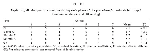 Anesthetic induction was performed in such a way that the animals could remain intubated, although under spontaneous ventilation, for flow volume control. The objective of this procedure was to facilitate the study of the amplitude of diaphragmatic excursion using ultrasound, which is a safe, noninvasive method of analysis. This focus was chosen because, bearing in mind the fact that volumetric reconstruction indicates ventilatory stability, ventilatory behavior reveals that diaphragmatic excursion reduces pulmonary compliance, thereby increasing airway resistance and leading to unequal distribution of ventilation to nondependent areas of the lung. Similar results have been obtained in studies considering the idea of independence for pressure values regarding volumetric compression generated by the cephalic positioning of the diaphragm because, when the two levels of pressure were compared (10 mmHg and 15 mmHg), there were no statistically significant differences between the responses, which indicated volumetric readaptation by the end of the procedure, that is, 5 minutes after partial gas release from the abdominal cavity, which had remained under insufflation for 60 minutes.(16-17)