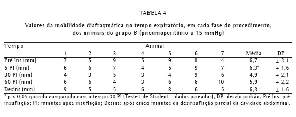 O mesmo é observado nas Tabelas 3 e 4, as quais representam o gradiente da mobilidade diafragmática no tempo expiratório em relação ao tempo operatório (média ± desvio padrão) dos grupos A e B.