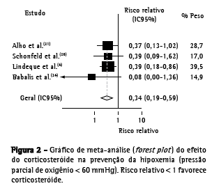 Na análise isolada do risco relativo de cada estudo, todos mostraram uma redução do risco de desenvolver SEG, mas em apenas dois estudos(21,22) a redução foi significativa (Figura 1 e Tabela 2). O risco relativo total de desenvolver SEG foi 0,16 (IC95%: 0,08-0,35) no grupo que recebeu corticosteróide em comparação com o grupo controle (valor p <0,001). O número que necessita ser tratado com corticosteróide para prevenir um caso de SEG foi 5. Não houve heterogeneidade significativa (valor p = 0,87). Na análise isolada do risco relativo de cada estudo, todos mostraram uma redução do risco de desenvolver hipoxemia, mas em apenas um estudo(4) a redução foi significativa (Figura 2 e Tabela 3). O risco relativo total de desenvolver hipoxemia foi 0,34 (IC95%: 0,19-0,59) no grupo do corticosteróide em comparação com o grupo controle (valor p <0,001). O número que necessita ser tratado com corticosteróide para prevenir um caso de hipoxemia foi 5. Não houve heterogeneidade significativa (valor p = 0,75).
