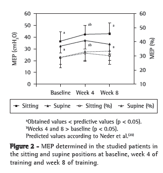 In the present study, MIP, MEP, FVC, and endurance obtained in the sitting position were compared with those in the supine position. A difference between the two positions was found for MIP at baseline, suggesting that the sitting position is disadvantageous for these patients.(24-26) However, this difference between the sitting and supine positions did not persist after 4 and 8 weeks of training, possibly due to the fact that the sitting position was adopted during the training sessions, thus minimizing any disadvantages for these patients.