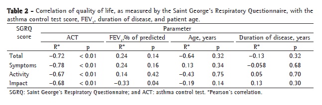 Some objective measures, such as pulmonary function and symptom diary cards, are frequently used for assessing the degree of asthma control. However, quality of life involves multidimensional (physical, emotional, and social) aspects and is therefore difficult to estimate by means of objective parameters.(21,22) Some studies have reported a poor correlation between pulmonary function (an objective parameter) and quality of life.(8,10-12,22,23) In the present study, there was a poor correlation between FEV1 and quality of life as assessed by the SGRQ. In contrast, a good correlation was found between the ACT score and quality of life. Studies in this area are scarce and controversial. Recently, one group of authors reported a good correlation between the ACT score and quality of life as measured by the asthma quality of life questionnaire.(13)